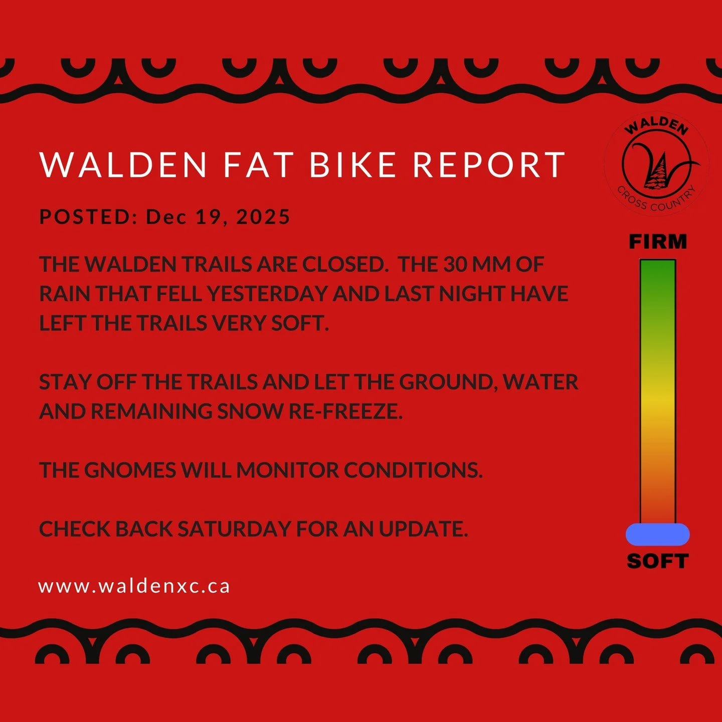 The Walden Trails are closed to riding. It was a great summer riding season this year, lasting over 6 months. The weather is into the fall freeze/thaw cycle, allowing no time for the trails to dry. The trails will reopen once the all wet areas are completely frozen.