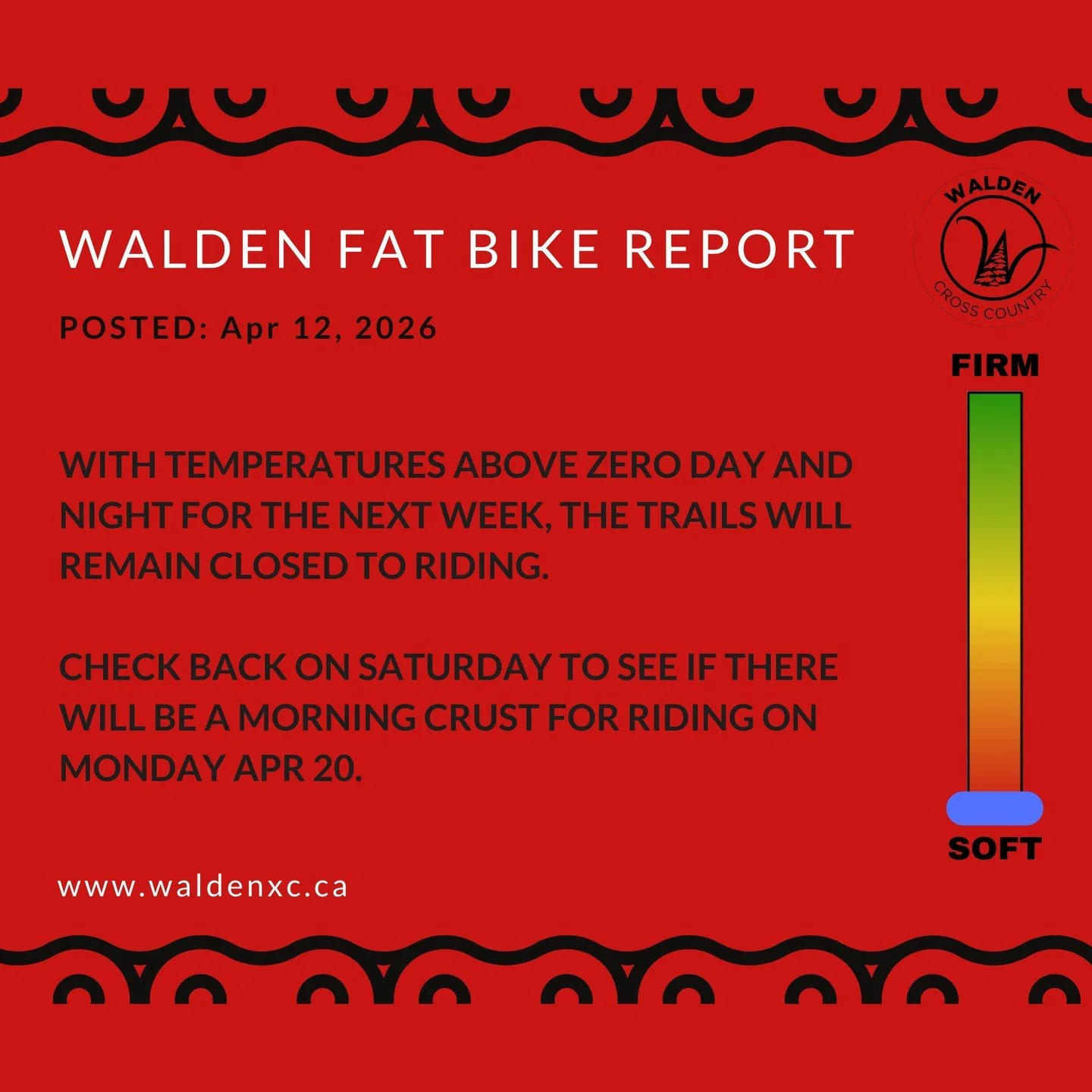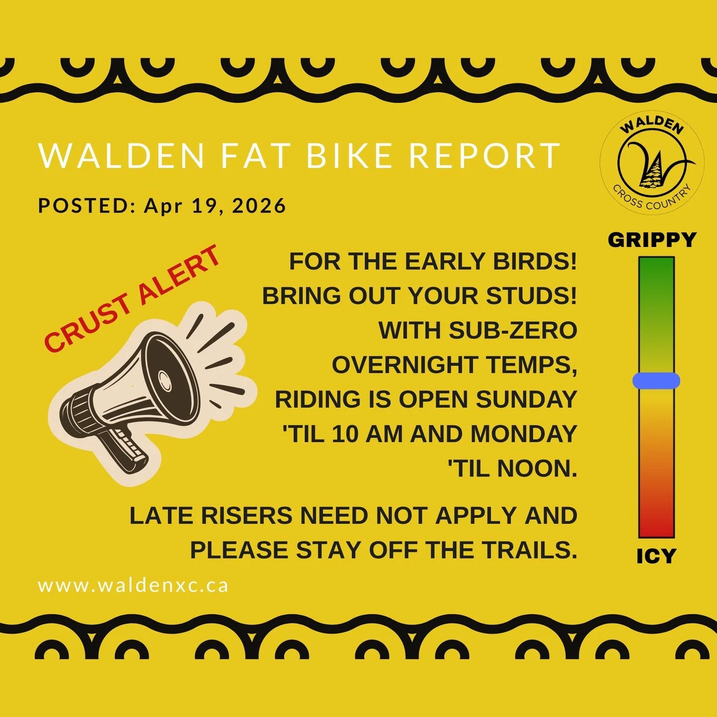 When spring is in the air, Fat Biking is a morning thing… When the temperature is above zero, please stay off the trails. Save the trails for cold morning rides. Trail conditions are posted in number of locations, including the Walden Cross Country website.